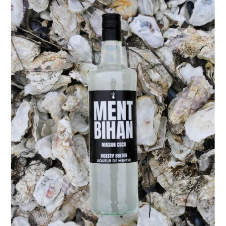 "Ment Bihan" pour "Petite Menthe", noir et blanc pour le Gwen Ha Du. Maison Coco originaire du Finistère Sud, a élaboré ce digestif de menthe artisanalement avec pour singularité d’être moins alcoolisé et moins sucré. Cette liqueur s’exprime avec une belle saveur de menthe légèrement poivré délicieusement rafraîchissante. Il s’agit de la même liqueur que « Fc Menthe » seule l’étiquette change.